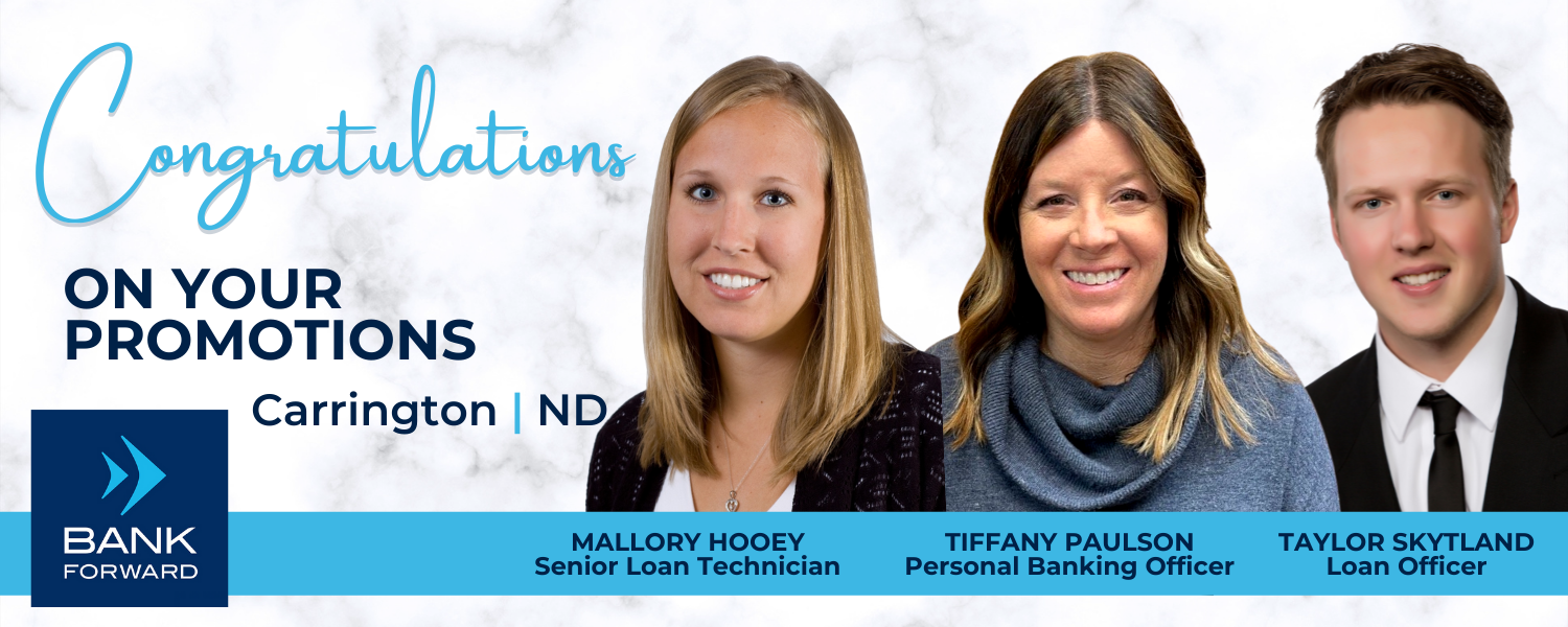 Bank Forward is pleased to announce the promotion of Mallory Hooey to Senior Loan Technician, Tiffany Paulson to Personal Banking Officer I, and Taylor Skytland to Loan Officer. All three work in the Carrington branch.