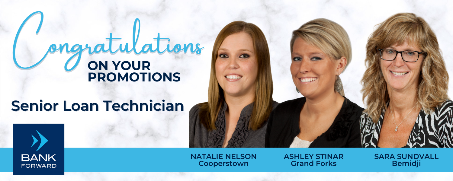Bank Forward is pleased to announce the promotion of Natalie Nelson, Ashley Stinar, and Sara Sundvall to Senior Loan Technician.