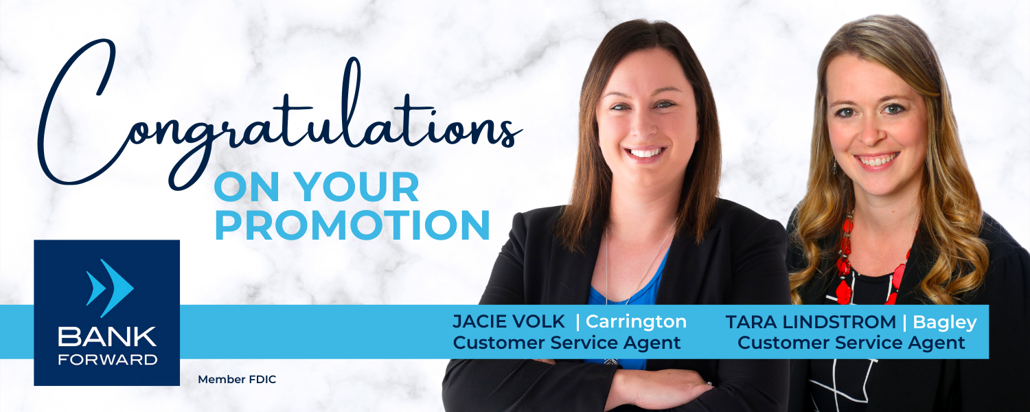 Bank Forward is pleased to announce the promotion of Jacie Volk and Tara Lindstrom to Customer Service Agents.